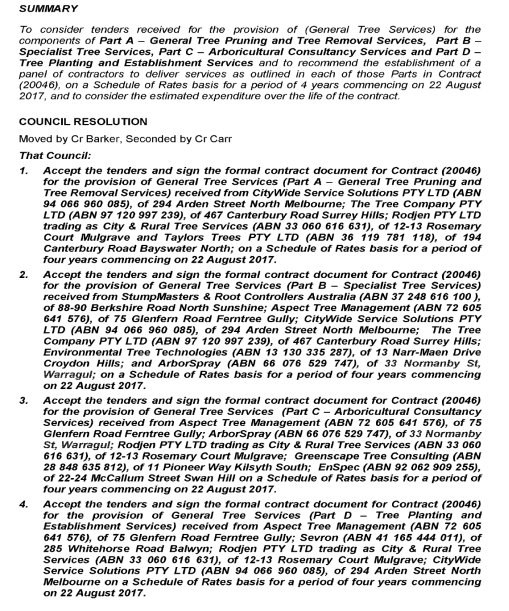 Moved by Cr Skilbeck, Seconded by Cr Carr That Council: 1. Extends Contract 20046 – General Tree Services, for a period of two years with the following: Contract Part A – General Tree Pruning and Removal Services · Citywide Service Solutions PTY LTD (ABN 94 066 960 085), of 294 Arden Street North Melbourne; · The Tree Company PTY LTD (ABN 97 120 997 239), of 467 Canterbury Road Surrey Hills; · Vegetation Group Australia PTY LTD (ABN 58 161 370 645), of Unit 1, 475 Blackburn Road, Mount Waverley, Contract Part B – Specialist Tree Services · Stumpmasters and Rootcontrollers Australia (ABN 37 248 616 100), of 103 Maffra Road Coolaroo · Aspect Tree Management PTY LTD (ABN 72 605 641 576) of 34 Leather Street Bayswater · Citywide Service Solutions PTY LTD (ABN 94 066 960 085), of 294 Arden Street North Melbourne; · The Tree Company PTY LTD (ABN 97 120 997 239), of 467 Canterbury Road Surrey Hills; · Arbor Spray (ABN 66 076 529 747), of 21A Albert Road Drouin; Contract Part C – Arboricultural Consultancy Services · Aspect Tree Management PTY LTD (ABN 72 605 641 576) of 34 Leather Street Bayswater · Arbor Spray (ABN 66 076 529 747), of 21A Albert Road Drouin; · Greenscape Tree Consulting (ABN: 28 848 635 812, of 11 Pioneer Way Kilsyth South; Enspec PTY LTD (ABN 92 062 909 255) of Unit 2, 13 Viewtech Place Rowville; Contract Part D – Tree Planting and Establishment Services · Aspect Tree Management PTY LTD (ABN 72 605 641 576) of 34 Leather Street Bayswater · Sevron PTY LTD (ABN 41 165 444 011) of Unit 21, 107-113 Heatherdale Road Ringwood · Citywide Service Solutions PTY LTD (ABN 94 066 960 085), of 294 Arden Street North Melbourne; 2. Notes the expenditure under Contract 20046 – General Tree Services as outlined in the Financial Section of this report. |