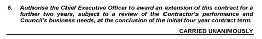 The term of the contract was for an initial four years and commenced on 1 October 2017. The contract allowed for an option to extend the contract for a further two years at Council’s discretion and was awarded to:
